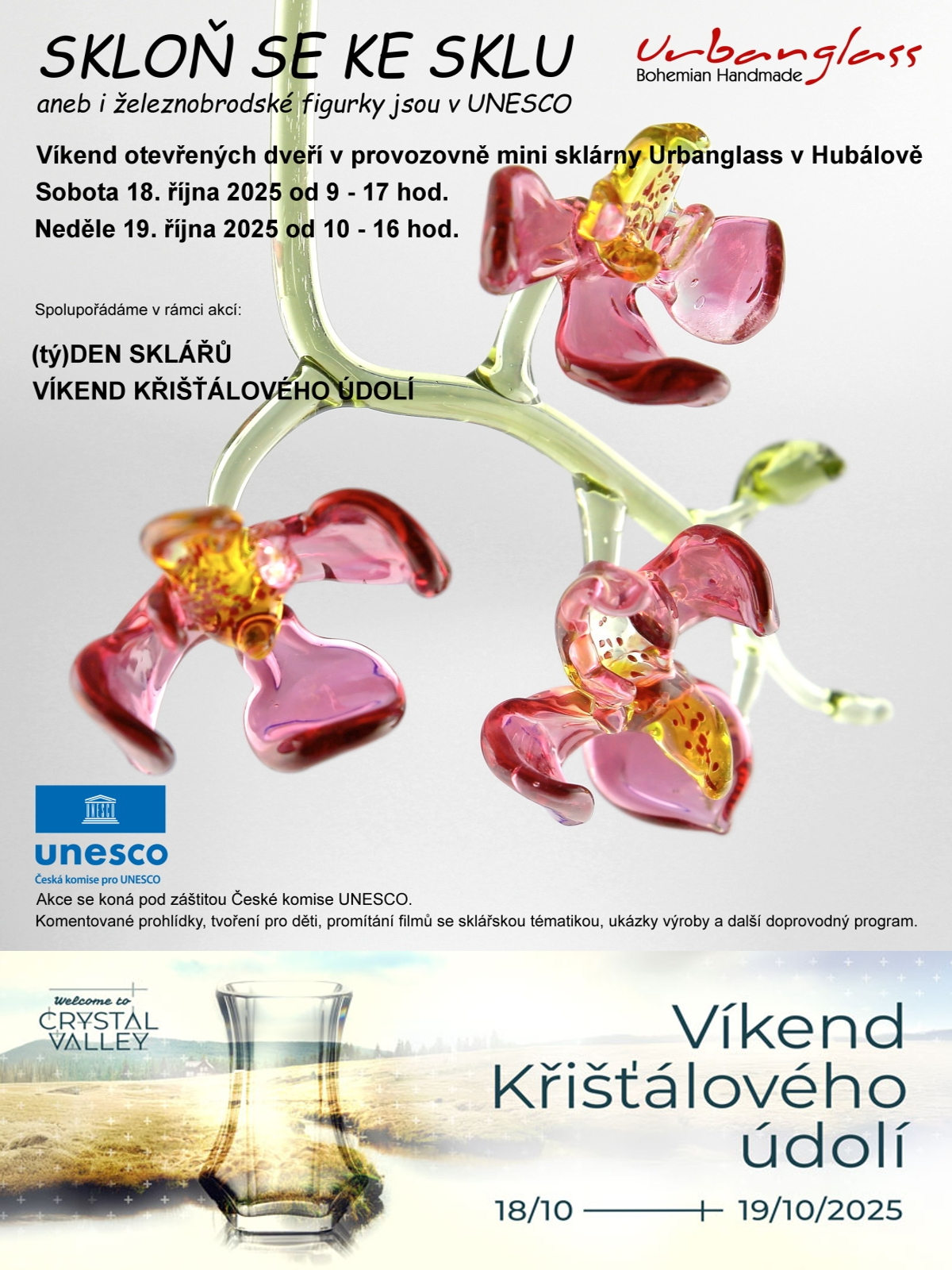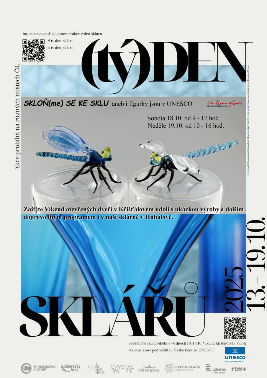 Skleněné železnobrodské (a především ty naše) figurky patří od loňského roku mezi poklady UNESCO. A právě na oslavu tohoto svátku sklářů a rámci akcí (tý)Den sklářů a Víkend Křišťálového údolí spolupořádáme i my víked otevřených dveří v naší provozovně.